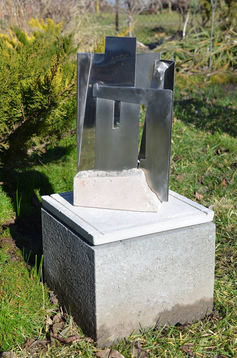 Sculpture that can be placed outside and differently.I can see interesting reflections and influences from all sides. The combined lights of the outside and inside of the outside and inside are on the matte and glossy is an exciting sculpture because it evokes a different thought from each side...