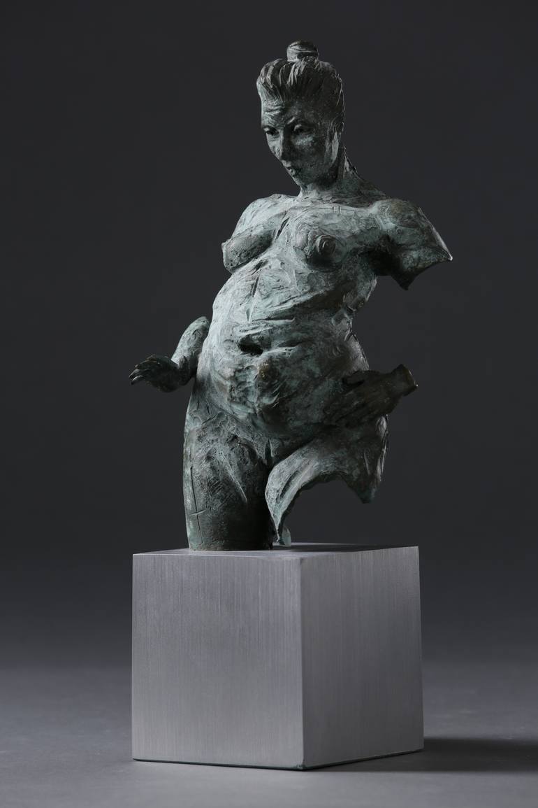 Torso of a naked woman.Sculpture made of bronze.Woman on the cube
