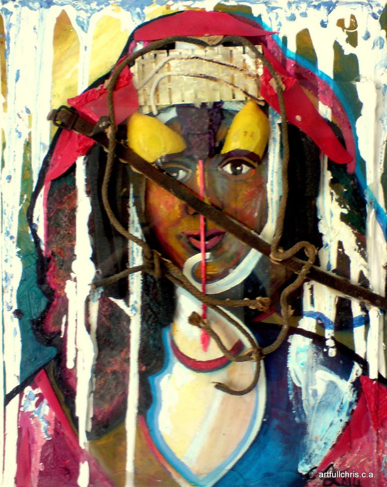 from just a painted face ,with the addition of mixed media,the result is a more power full image; a oil painting that gives a more intensive out put, a sence of humour can not be ruled out.also what can be constructed out of very little; std mixed media constructive painting;