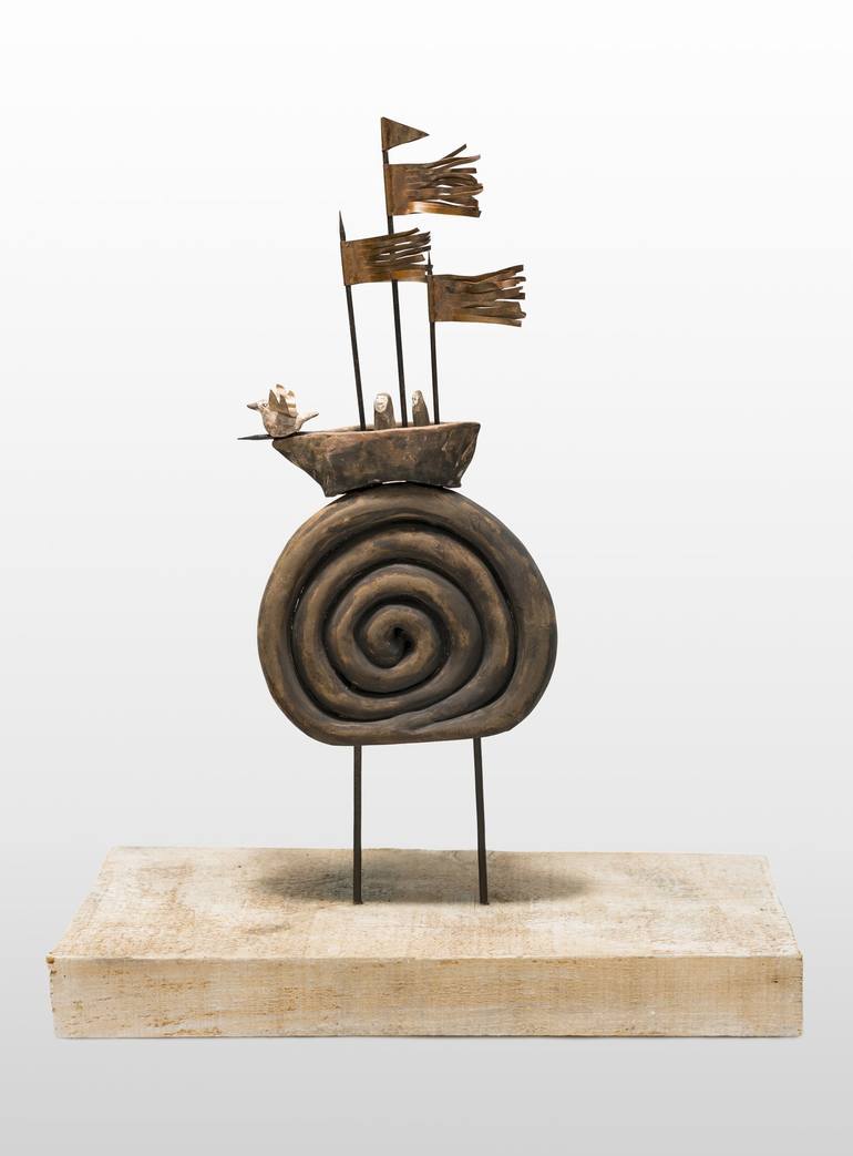 This work is inspired by an idealized ship that could be from a medieval tale that rides a spiral wave, which gives the work its name. It is made of fired and painted clay with copper and steel elements on wood. There is a seagull perched on the bow of the ship and its wings are made of copper and s...