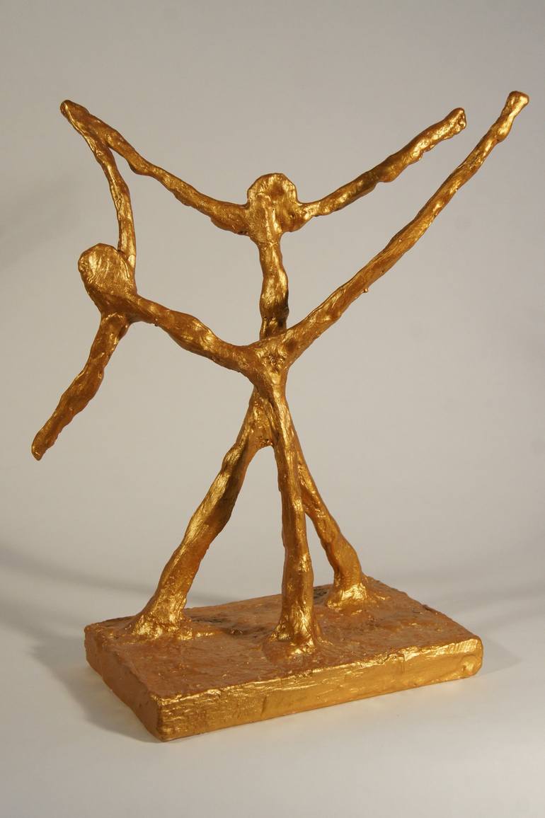 Figure made out of plaster, on a wooden board, painted with gold color. A dance performance with a couple. A dreaming situation (rêverie) to wish for.