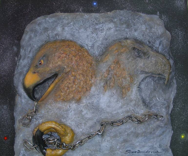“LA VOLUNTAD DE SER LIBRE: EMERGIENDO A LA VIDA” El tema que intento expresar es el triunfo del pensamiento libre, que se despoja de viejas ataduras. Para realizar este trabajo elegí el símbolo masón del águila bicéfala y (como licencia artística) la personifiqué y le agregué cadenas. Mi águila b...