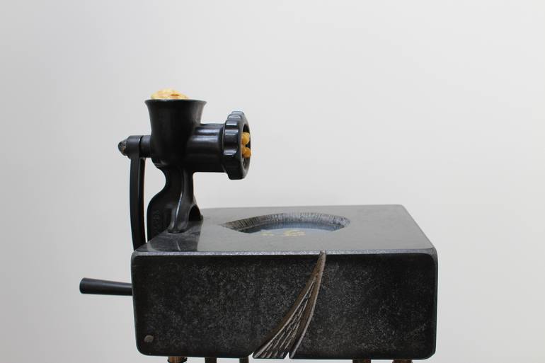 The work was inspired by ecology. The mill displays change, the amber symbolizes water, stone means stability. Yet there's an indenture in the stone, from just some water, meaning that in our lives - nothing stays stable.