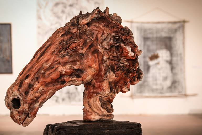"MUSTANG HEAD" dim: 65cm h x 60cm w x 26cm w material: modeling mass, burned wood,grout,iron... weight: 27 kg