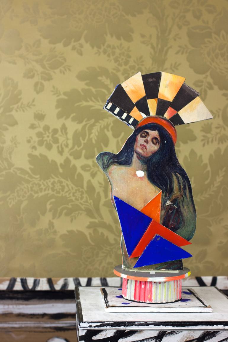 "Madonna in Trance" narrative sculpture The cardboard surface consists of photo material, works from the project "artrecycle", acrylic paint and is protected by an acrylic varnish. The figurative or abstract forms and their surfaces result in different combinations of forms and different perspective...