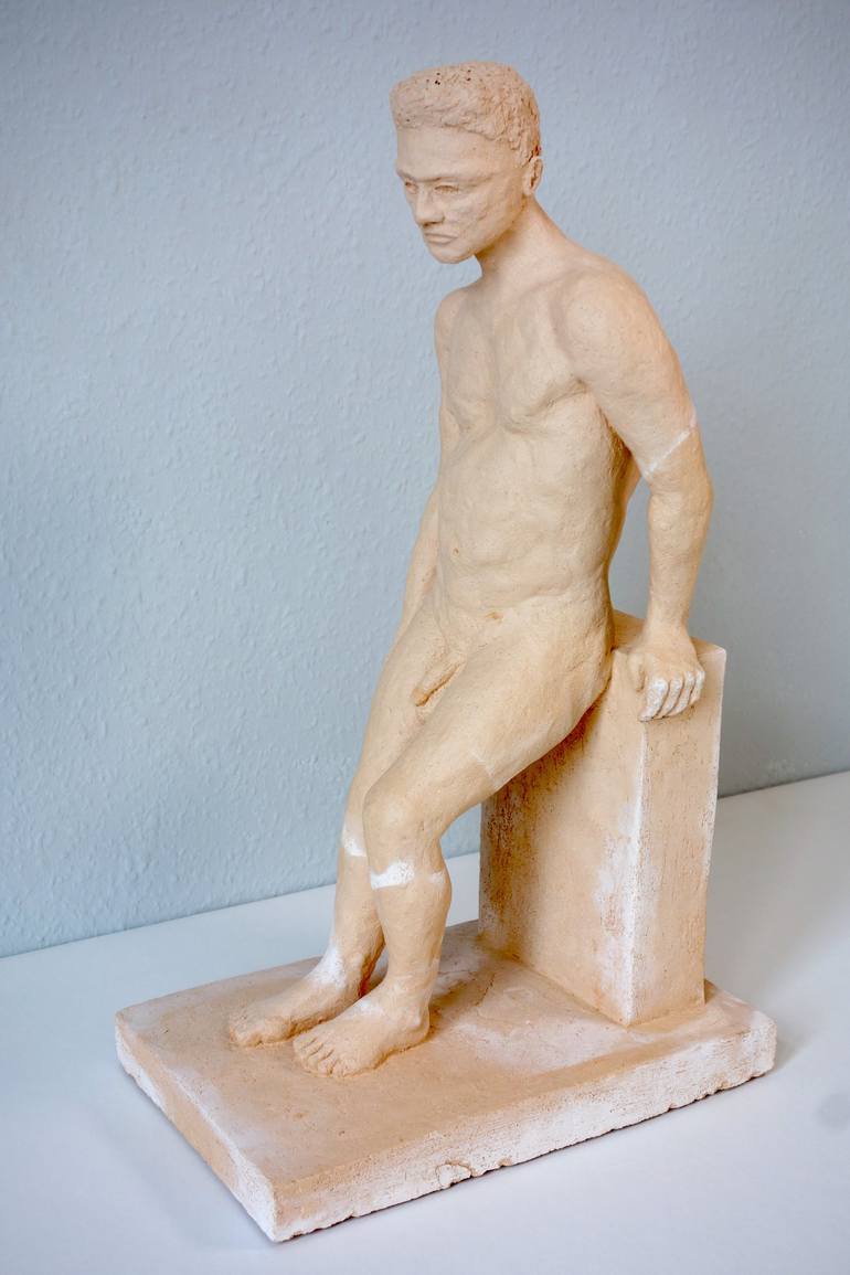 The male model Gordon has a both majestic and vulnerable appearance that I hope is identifiable in this standing figure of him. The figure is modelled in stone clay burned only to non-stone clay temperature around 1000 degree celsius, so is not guaranteed as water and frost secure to outdoor use. Th...