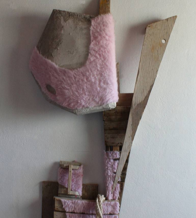 The art piece is a striking representation of contemporary themes, featuring a large element made of concrete and recycled wood from construction sites, covered in pink fur. This arrangement mimics the torso of a strong man, embodying a contemporary nude with elements that resonate with the contempo...