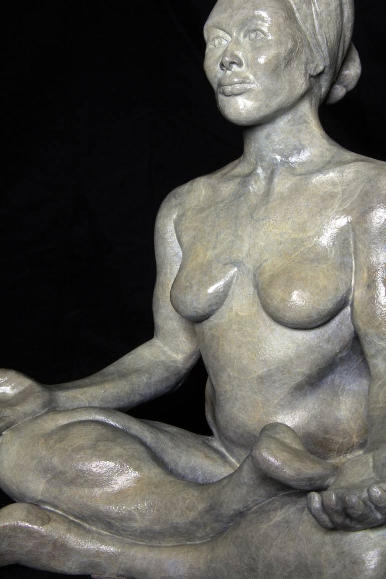 Thoughtful and reflective seated female bronze sculpture, Edition 1 of 12. Meditation’s soft volumes combined with her velvety lines and full mass radiate a peaceful energy that make this finely rendered work a perfect accent décor for your home, personal art gallery or business. This 12" x 15" x ...