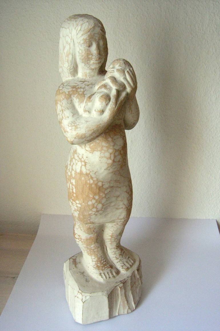 This Mother is sculpted in lime wood. Its surface is treated with a chalk-glue mixture following an ancient technique - medieval sculptures had been done that way. The base is not fully smooth allowing the possibility to slightly rock the sculpture and I just left it that way as I felt it fits the t...