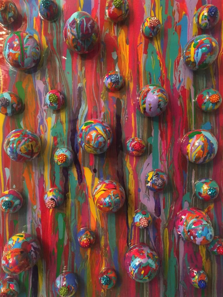 This piece incorperates a method of dripping paint and allowing it to move over the wood shapes. Then the entire piece is covered in a clear resin coating and then I add multi colored crystal beads.A very bright and very colorful sculpture for the table top or wall. Put a spot light on it and watch ...