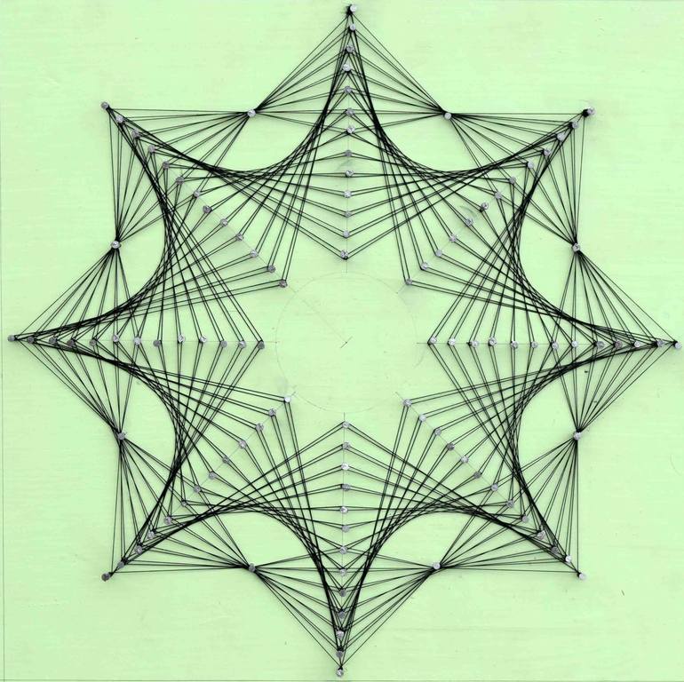 This piece comes box framed with glass, framed in a white wooden frame. I like creating geometrical patterns through various mediums. I like them to be precise in terms of their shape and construction. Using threads and nails has been one of the many creative ways I could use to make geometrical sha...