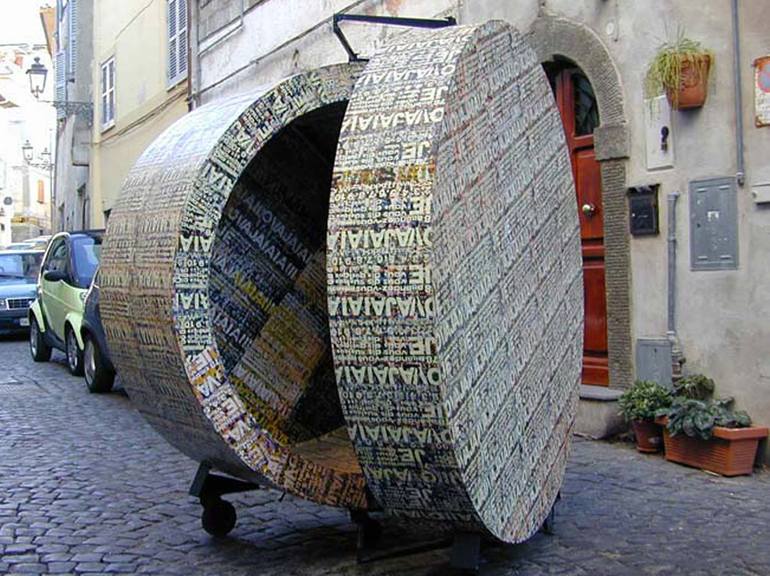 MEGABOX, Sculpture installated, 1992, diameter 180 cm, wood, serigraphie on paper 26 colours, iron, wheel, locomotion system with iron gear, stereo recorder. I was inspired by the boxes that were used in 1700, small symbolic everyday objects upholstered / upholstered with canvas or colored / decor...