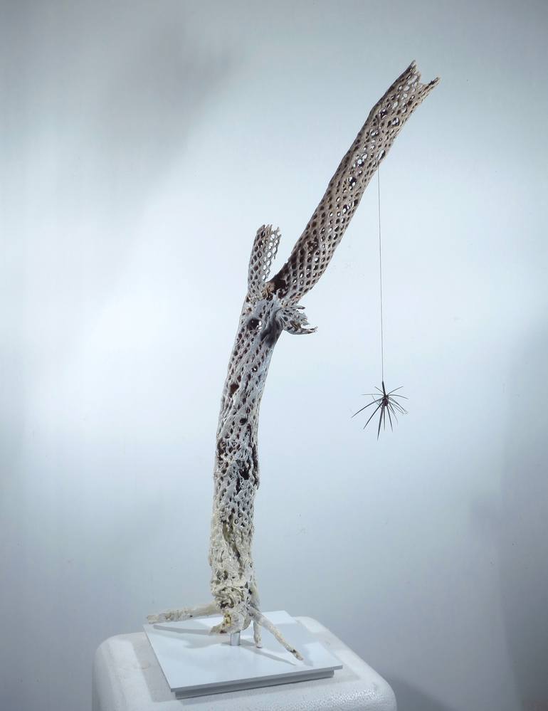 This is a sculpture made from a cholla cactus skeleton dangling a barrel cactus needle cluster. It represents how life can spring from death.