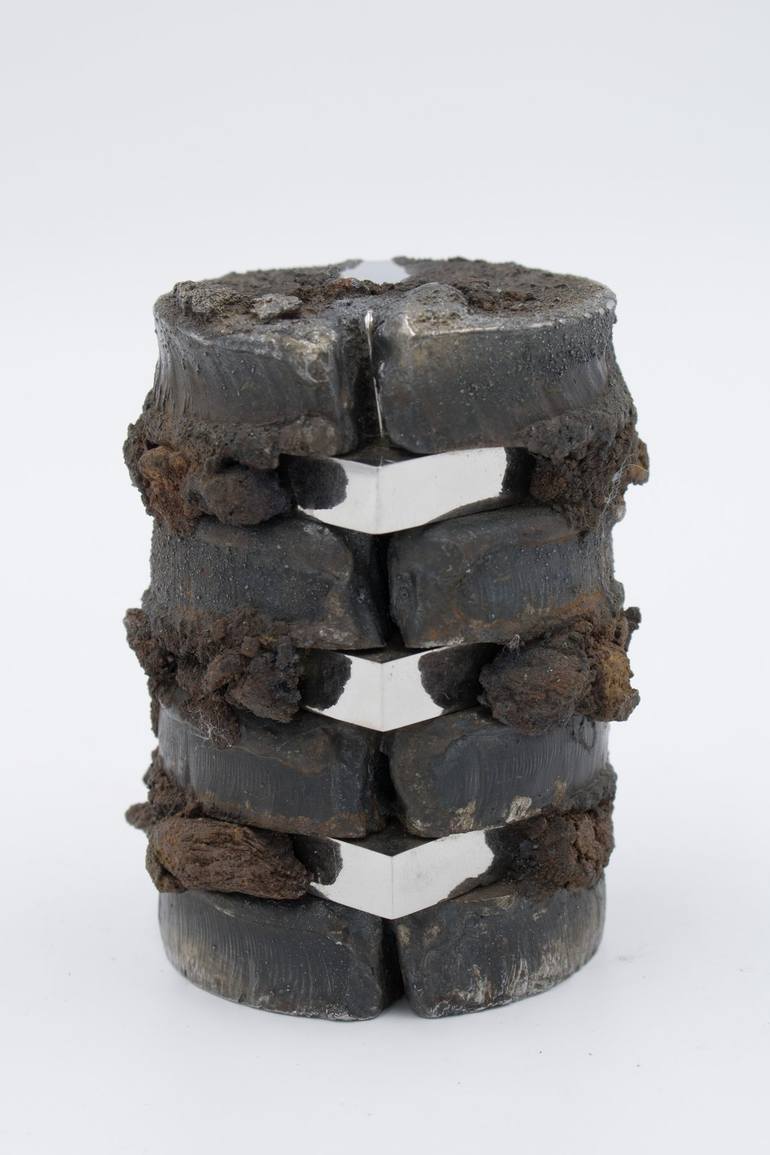The unity of the cylindrical form is divided by the outbursting triangles. This contrast is also repeated on the surface. While the cylinder is rusted and rough, the triangles are smooth and shiny. The rough surface is achieved by using rusted iron powder.
