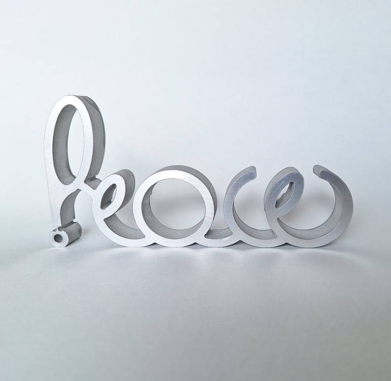 The peace-war artwork is a sculptural ambigram, reading „PEACE“ from the front and „WAR!“ from the back.