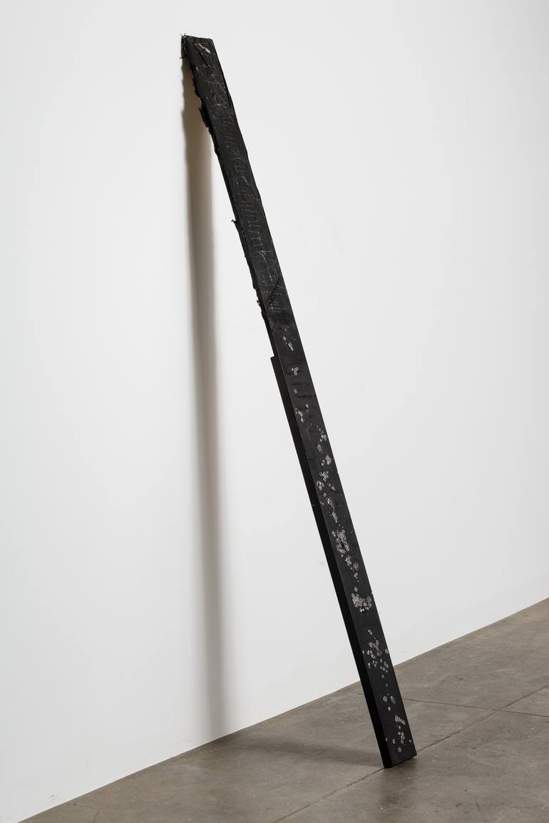 SCRATCHES, BURNS, MELTED LEAD, THIS LEANING SCULPTURE IS FOR LARGE CONTEMPORARY SPACES.