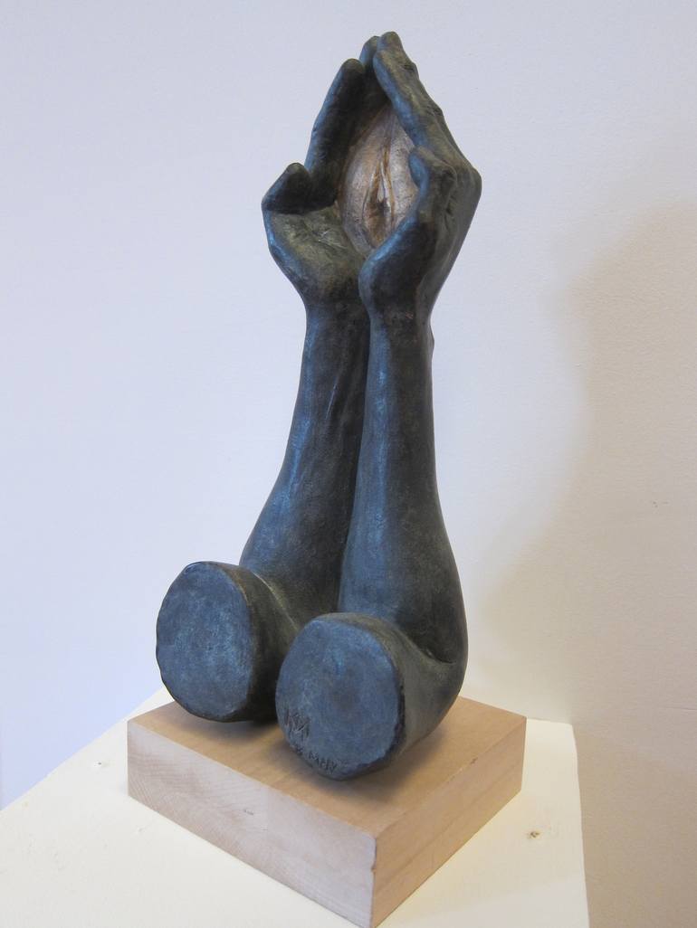 The arms are in the position of prayer, in the hands holding the female Terracotta(Ceramic) material is colored in bronze, in between hands the female is colored gold I want to give the message: All males who want a female, when they receive must take care of her and keep it like something precious....