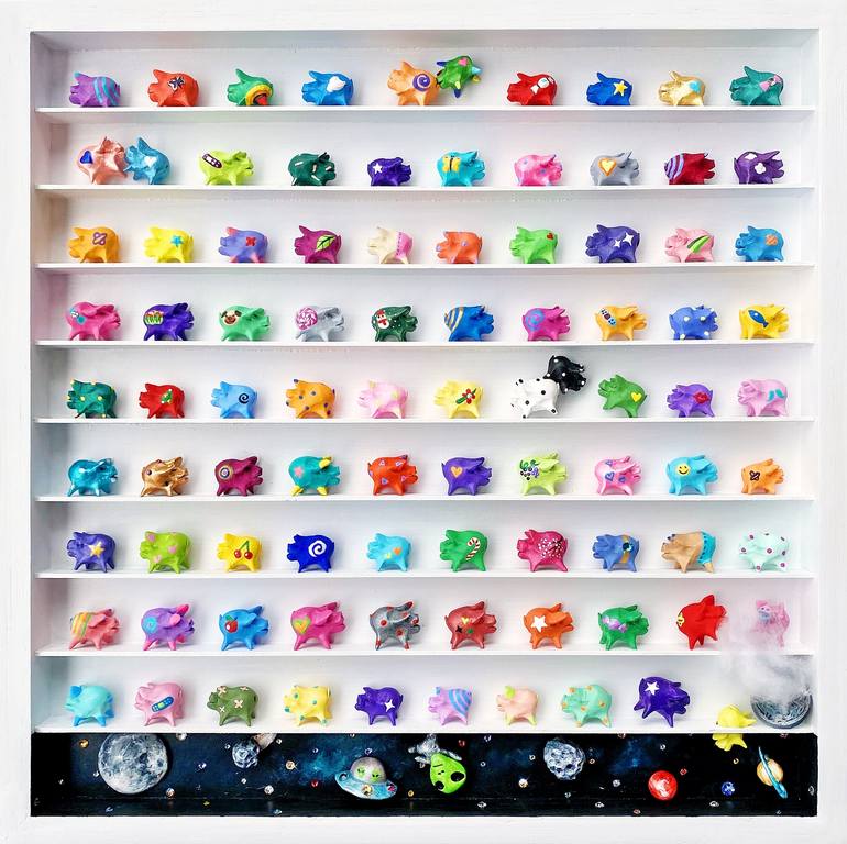 Acrylic on ceramic on wood panel The little pig figurines are symbolic of all people. Each pig figurine measures 0.5" x 1" x 0.5". All of the pigs are made out of ceramic, while some of them are painted with acrylic. Each pig is handmade, a mold was not used because it is a meditative practice of ...