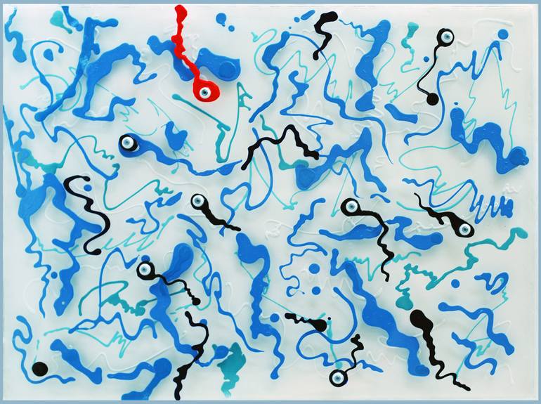 This piece is a multi level clear acrylic sheet artwork with 1/2 inches between 3 surfaces of first wood and 2 pieces of acrylic. All mounted together with cyanoacrylite then each layer is painted with various shapes of acrylic paint, the final layer blue resin eyes were added to wet acrylic for eff...
