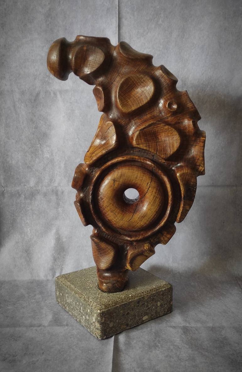 Rzeźba wykonana jest z drewna dębowego, na podstawie z polerowanego betonu. Abstrakcyjny charakter pracy nadaje jej niepowtarzalny wygląd i bardzo dobrze prezentuje sie w nowoczesnych wnętrzach. Struktura drewna tworzy niesamowity wzór. Beton w podstawie nadaje masywności i stabilności. Inspiracją d...