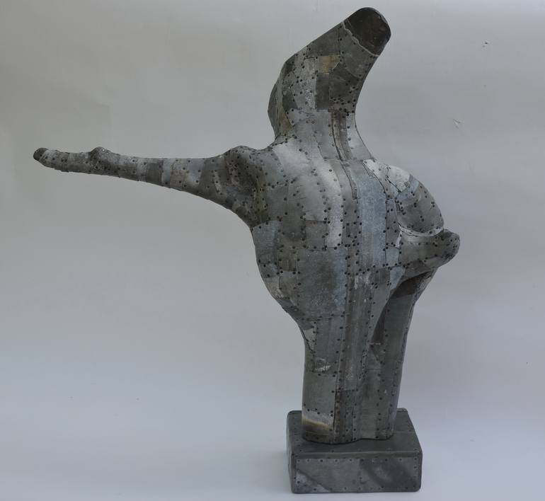 This work made wood basic and after put old zinc sheet all surface . This form is animal or people is up to your work focuses on texture and to positive -negative forms effect.