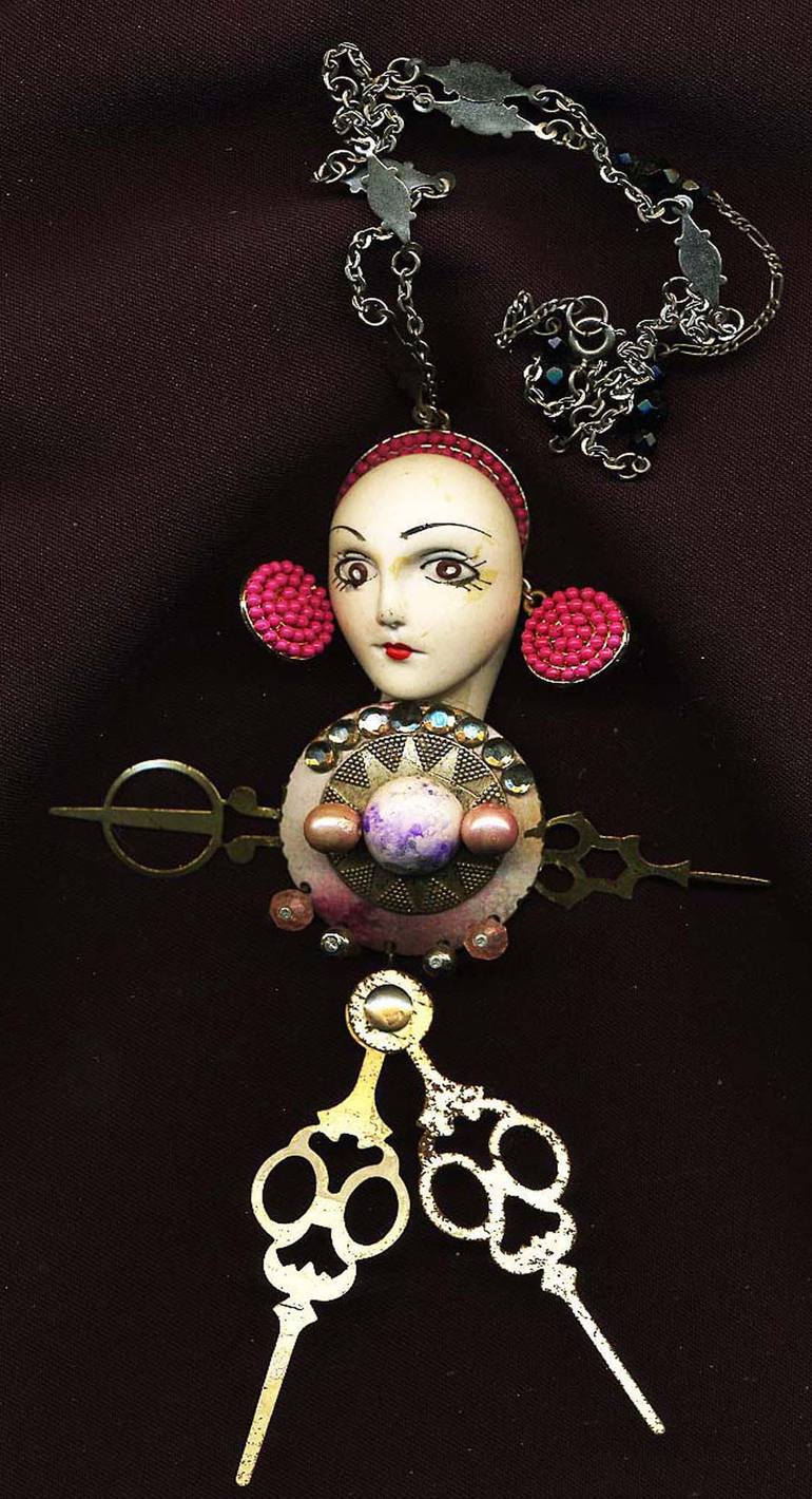 A whimsical doll pendant named ROSIE made from a variety of found objects with a embellished chain with black beads...chain is 11,5 inches long....a very unique fashion statement!