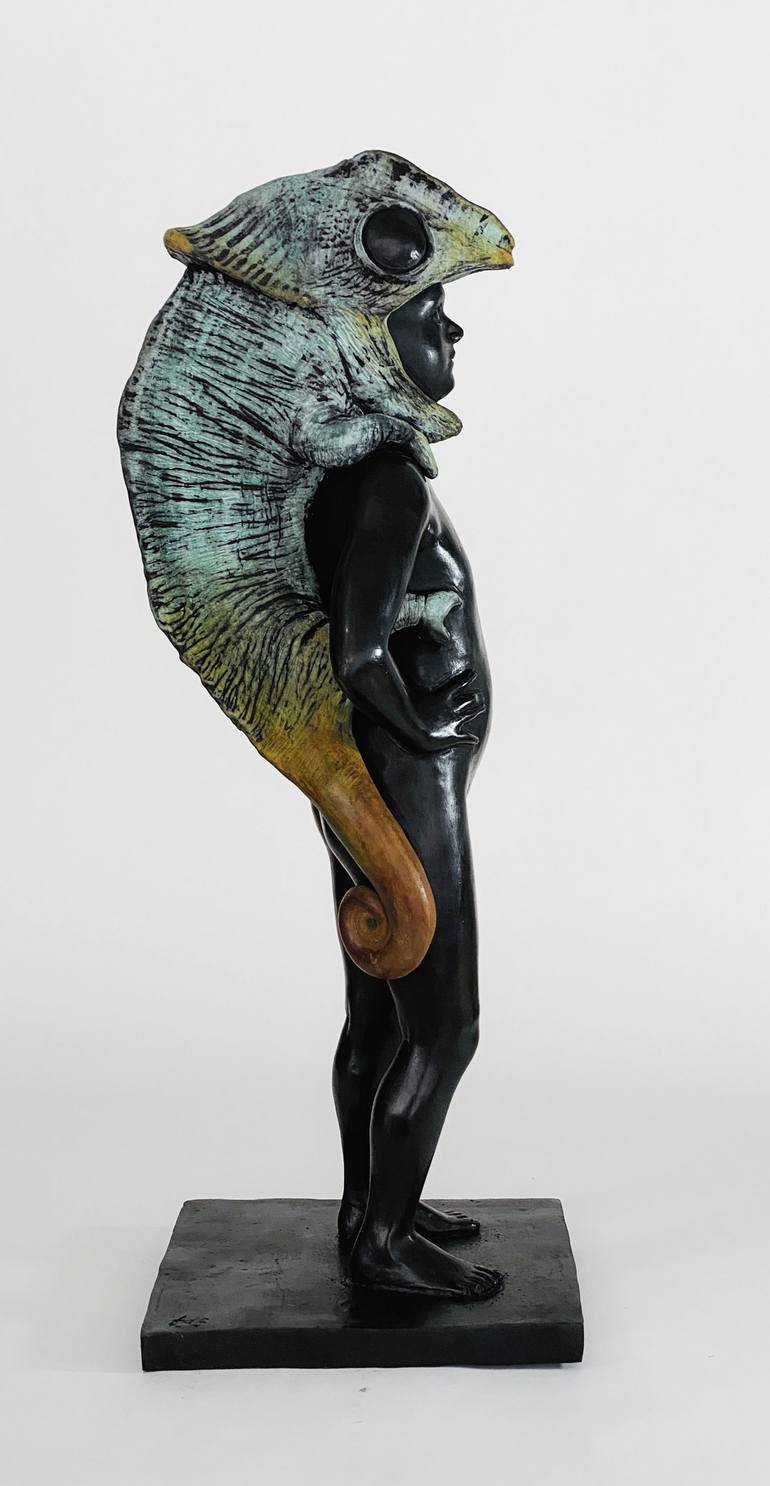 This piece was born as an experiment with bronze patinas: I wanted to know how vivid the colors could be with this ancient and alchemical process. I'm really fascinated by fire, and so happy that the colors turned out so brillant! the subject is a bit surrealist: the girl head is inside the chamaleo...