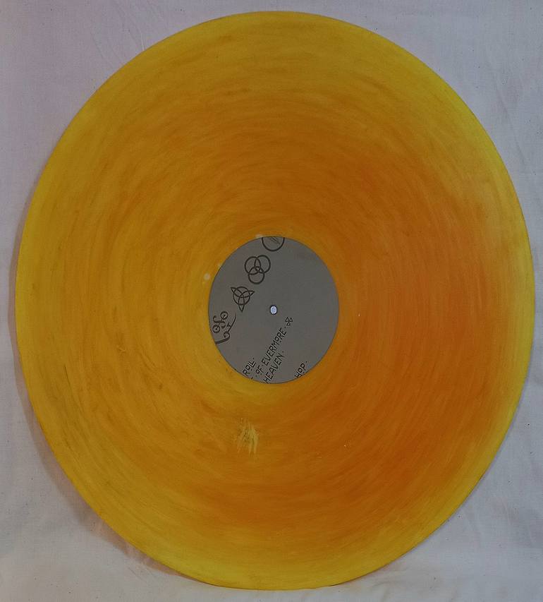 A round object, large oversized to look like a vinyl record . Oilpaint and paper on plastic