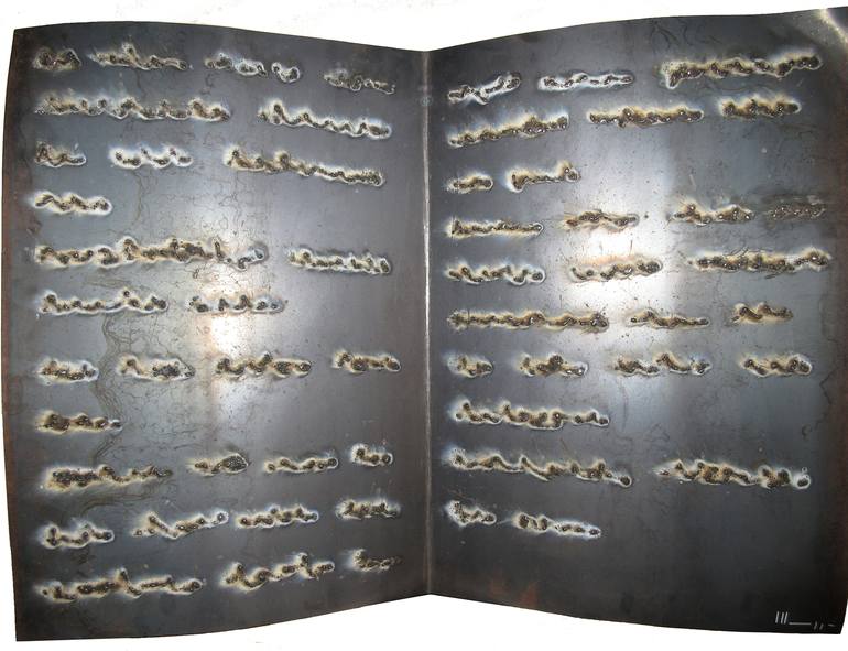Second work of the series of "Revelations". They are books of knowledge made in metal sheet shaped. The illustrations are realised with a series of welding points. It's possible to hang it on a wall or put it on a base.