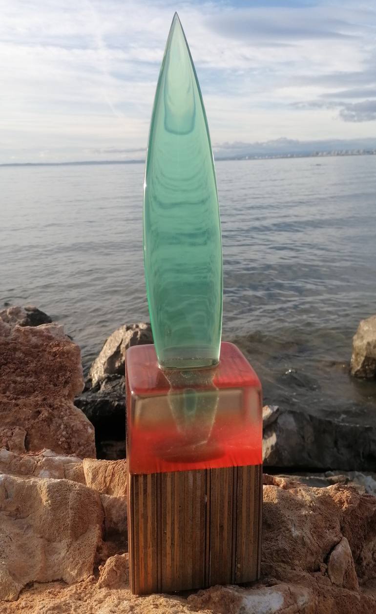 Designed lamp in sculpture Basis in wood avec surfboard in resin included in epoxy resin crystal LED lighting included