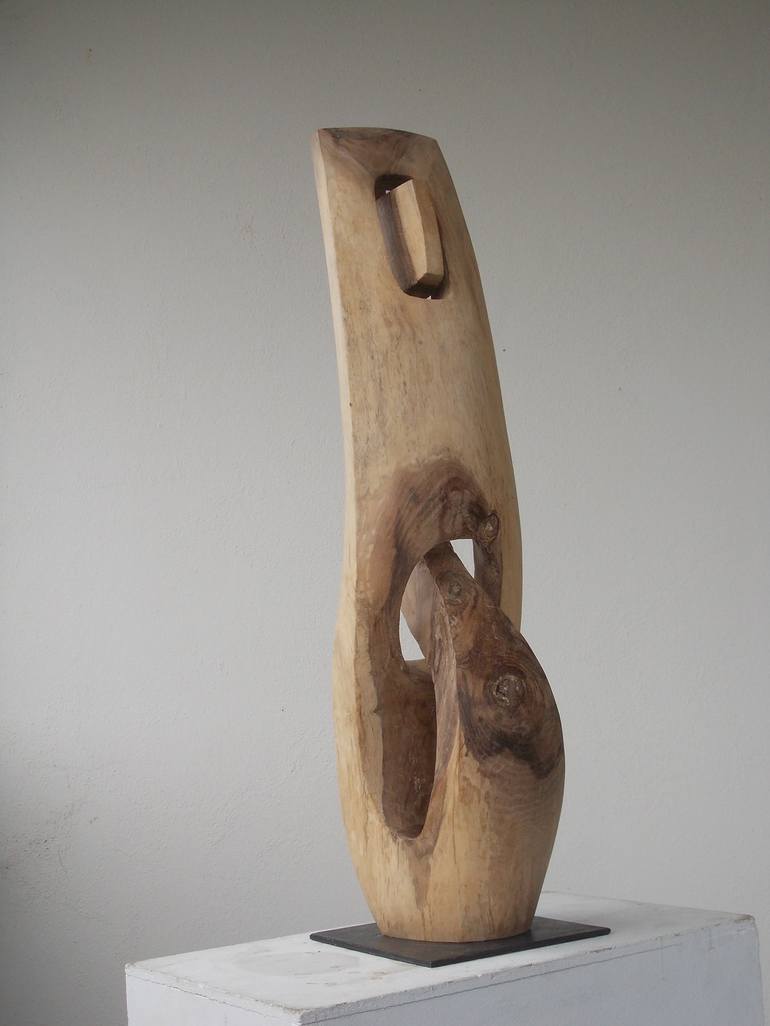 The sculpture is made of walnut wood. One part is like a shelter, another part penetrate it. I' m always interested in the specfic qualities and characters of the trees. So a walnut inside of its fruit has a hard shell which will be penetrated by the germ. But I 've found the shape intuitive and th...