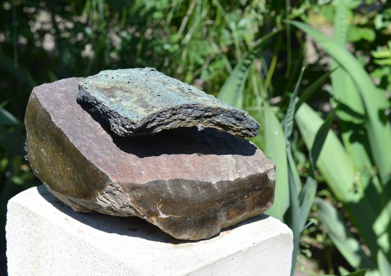 The rusted metal forms a harmonious unit with the green plants.Garden sculpture .Minimalist, clean forms that fit nicely into the natural environment.The meeting of the simplified environment and nature You can associate an animal with a creature watching in the garden It suggests calm, protection a...