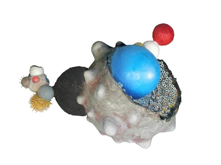 This sculpture is a highly abstract and imaginative piece created using resin. It features a dominant hollow spherical structure with a rough, uneven texture, resembling a porous surface. The largest element is a vibrant blue sphere situated within this cavity, surrounded by a cluster of cylindrical...