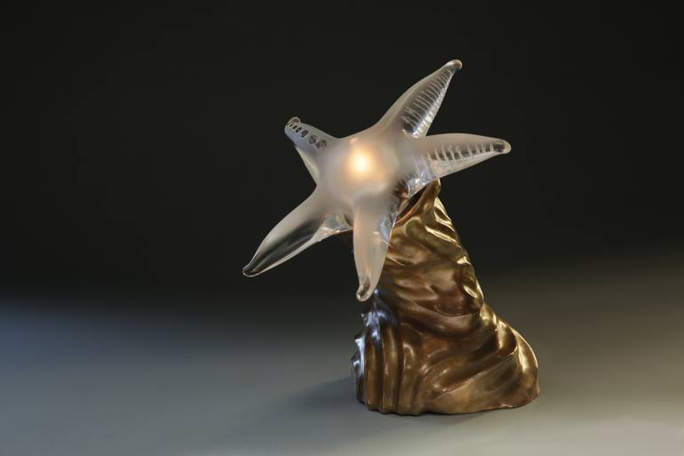 This sculpture originated from my experiments of re-creating ripples in sand to give a sense of movement and energy. This developed into the tree design. As the inspiration was aquatic I wanted the lines to flow into an underwater flower which is made of glass. There is a small light source inside t...