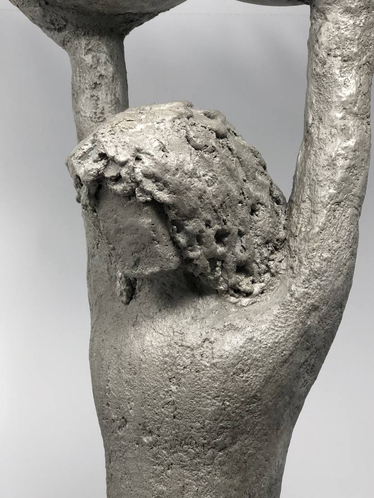 "Strength", represents the strength of man needed to put our divided world back together as a whole. The sculpture is done in heavily textured cement on a metal armature, mounted on salvaged hardwood painted in matte black and is sealed. Dimensions: 23" Height x 13" Depth x 10" Width Weight: 21.2 p...