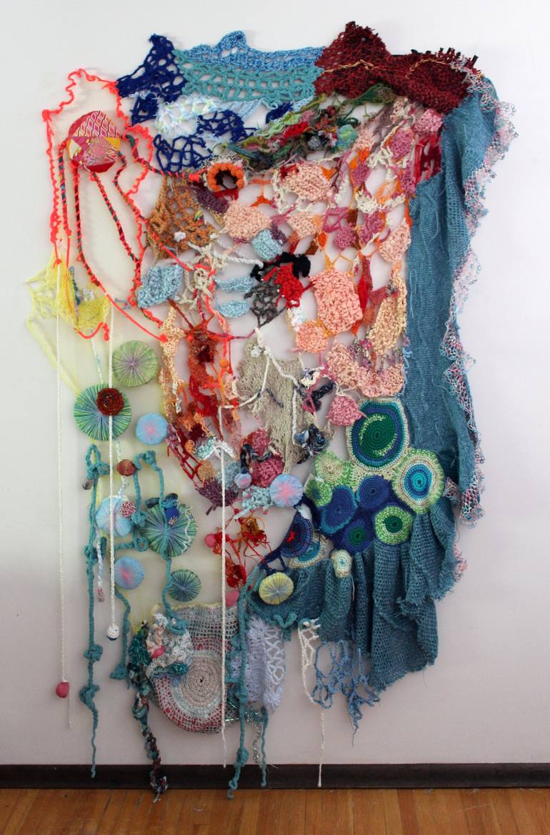 This artwork explores happiness of being, oneself as an island, a sunny morning by the sea, exploring local natural wonders, finding and listening to silence in between breaths, being in the moment, and love for all creation. I used mostly vintage silk and acetate ribbons to crochet the landscape, a...