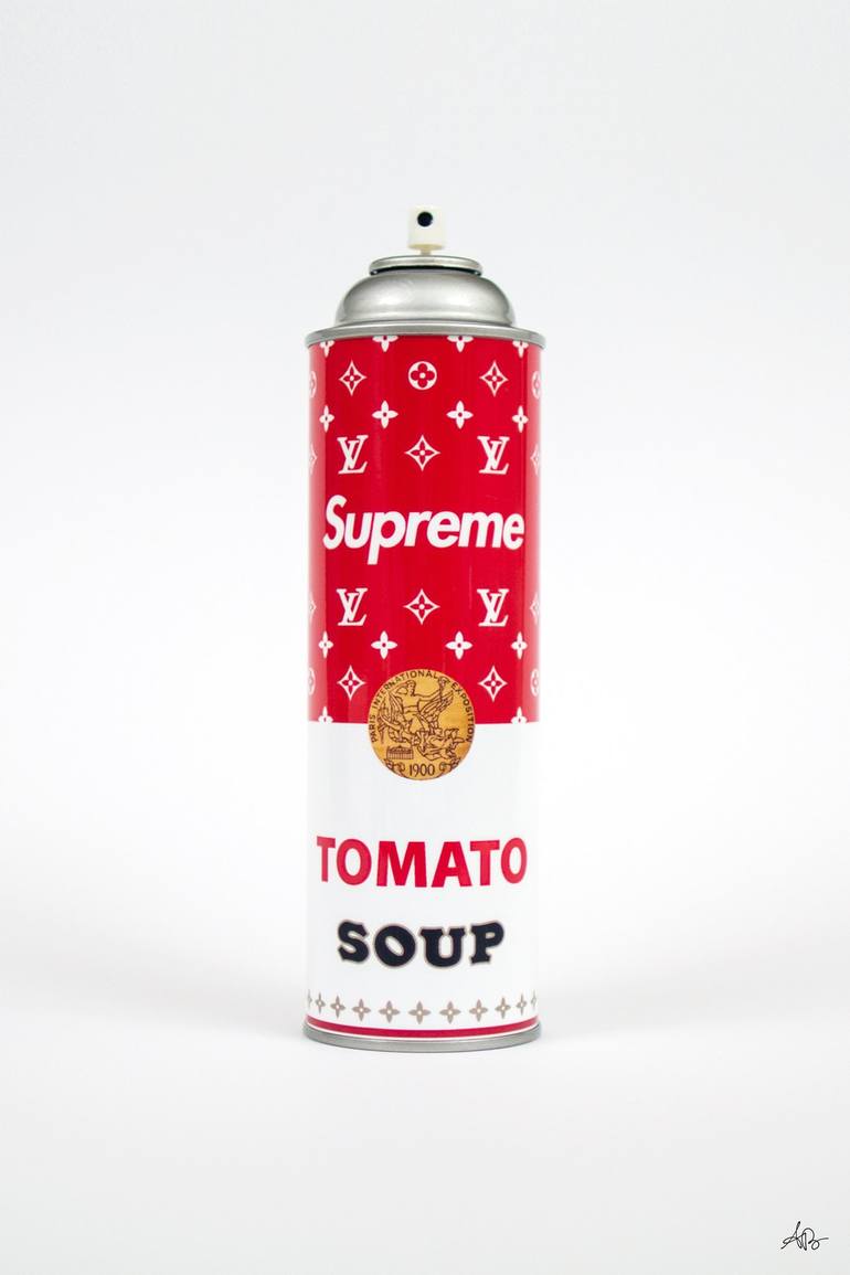 SUPREME LOUIS VUITTON TOMATO SOUP SPRAY PAINT CAN LIMITED EDITION 12/50 Artist: Antonio Brasko Title: Supreme Louis Vuitton Tomato Soup Spray Paint Can Limited Edition: 12/50 (Original/Signed) Medium: Acrylic, Canvas Dimensions: 9.5” x 2.5" x 2.5" inches (24cm x 6.35cm x 6.35cm) Contents: Filled w...