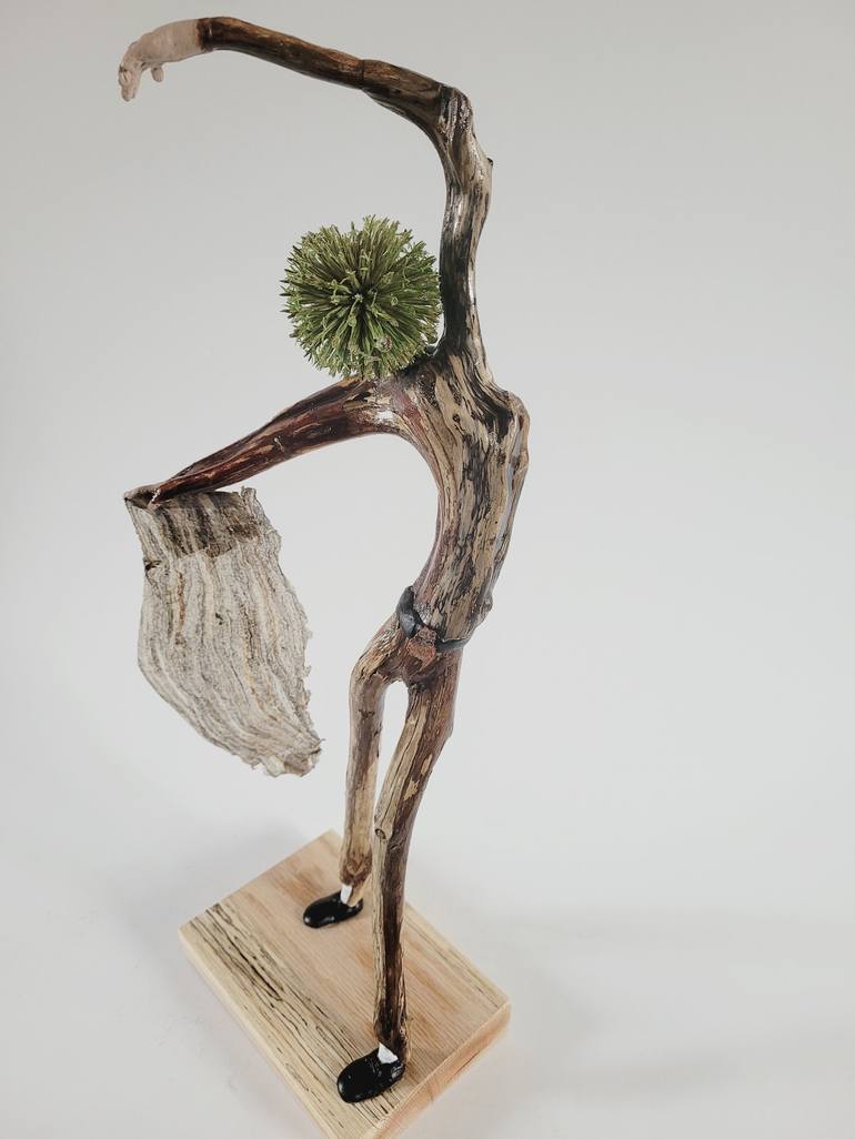 I was born and raised in Abitibi, a remote region of Québec known for its expansive forests and lakes. At a very early age, I developed my patience and observation skills during long fishing trips with my grandfather. Those qualities are readily apparent in my art today. I often describe myself as a sculptor-gatherer as nature provides the raw materials (wood, bones, flowers, etc.) from which I create my artworks. Most of my pieces are built around a central element that imposes itself early in the creative process. Often, that element is a piece of wood with a peculiar shape that evokes a body in motion or a very expressive posture. Additional elements are then added, selected and transformed so as to achieve a delicate balance between shapes, colours and textures. I use different techniques developed over the years to assemble the various elements that compose my sculptures in a seamless manner. I love to create for people, to see them be amazed and fascinated by the beauty of the world around us. My sculptures help them escape for a moment and see the world in a different way. I sometimes wonder if I will eventually run out of ideas for my sculptures. Fortunately, it seems that every new piece of material I collect brings with it its own, unique character and a renewed promise of a totally original creation.
