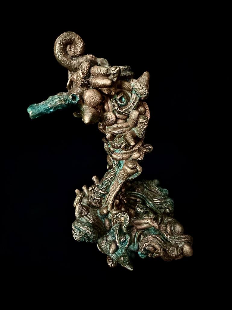 'The Calabash of Shamrock Gnomes' A sculpture I did focusing my style into a utilitarian framework (a calabash pipe), while its title came after its completion. After casting this in pewter I detailed and polished it, then immersed it in a copper-ion electroplating bath (no one sculpture possesses...