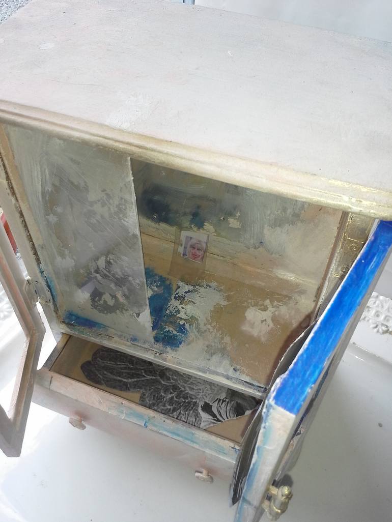 Remade jewelry box--Tabletop sculpture. This piece is a poignant visual meditation upon the life and untimely demise of the celebrity Anna Nicole Smith (ANS). It contains collaged elements: a black and white reproduction of the Winged Victory of Samothrace (wingless) covers one of the door panels, ...