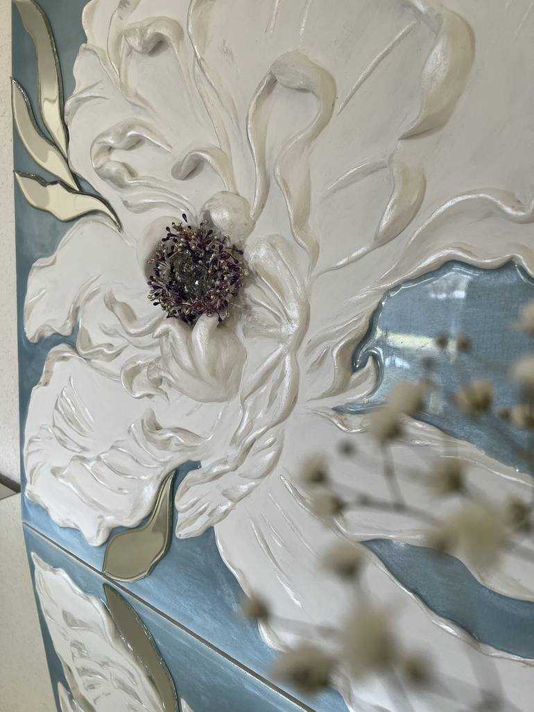 Japanese pearl flower with mirrored leaves and gold mirror centre is made in bas-relief technique on a transparent blue background and gives the impression of a flower floating on water. The smooth graceful lines of the flower leave a sense of harmony, the reflection of light and shadow in the mirro...