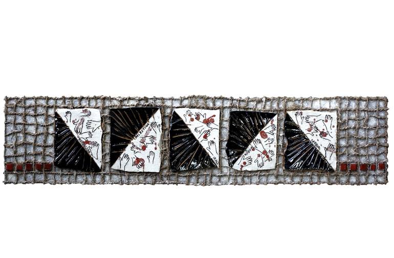 “The horror of wars” is a mosaic made up of five engobed, engraved, painted ceramic tiles, surrounded by a network of coconut fiber, and placed on treated wood. Each tile represents a country where there have been wars. They are divided in half: the black part has engraved signs that go in the direc...