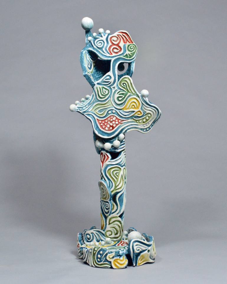 This is is inspired by the beauty of the wild stormy seas, from my visits to the Pacific coast of Mexico and Northwestern USA. The style of the sculpture is Magical Surrealism, containing fanciful creatures in a pattern of wild motion and color.