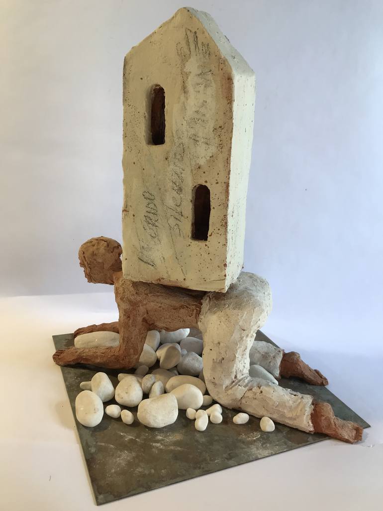 Scultura in terracotta policroma, rappresenta lo sforzo di nascondere un malessere interiore, la casa rappresenta il nostro vissuto, le nostre fragilità le nostre aspettative la nostra vita