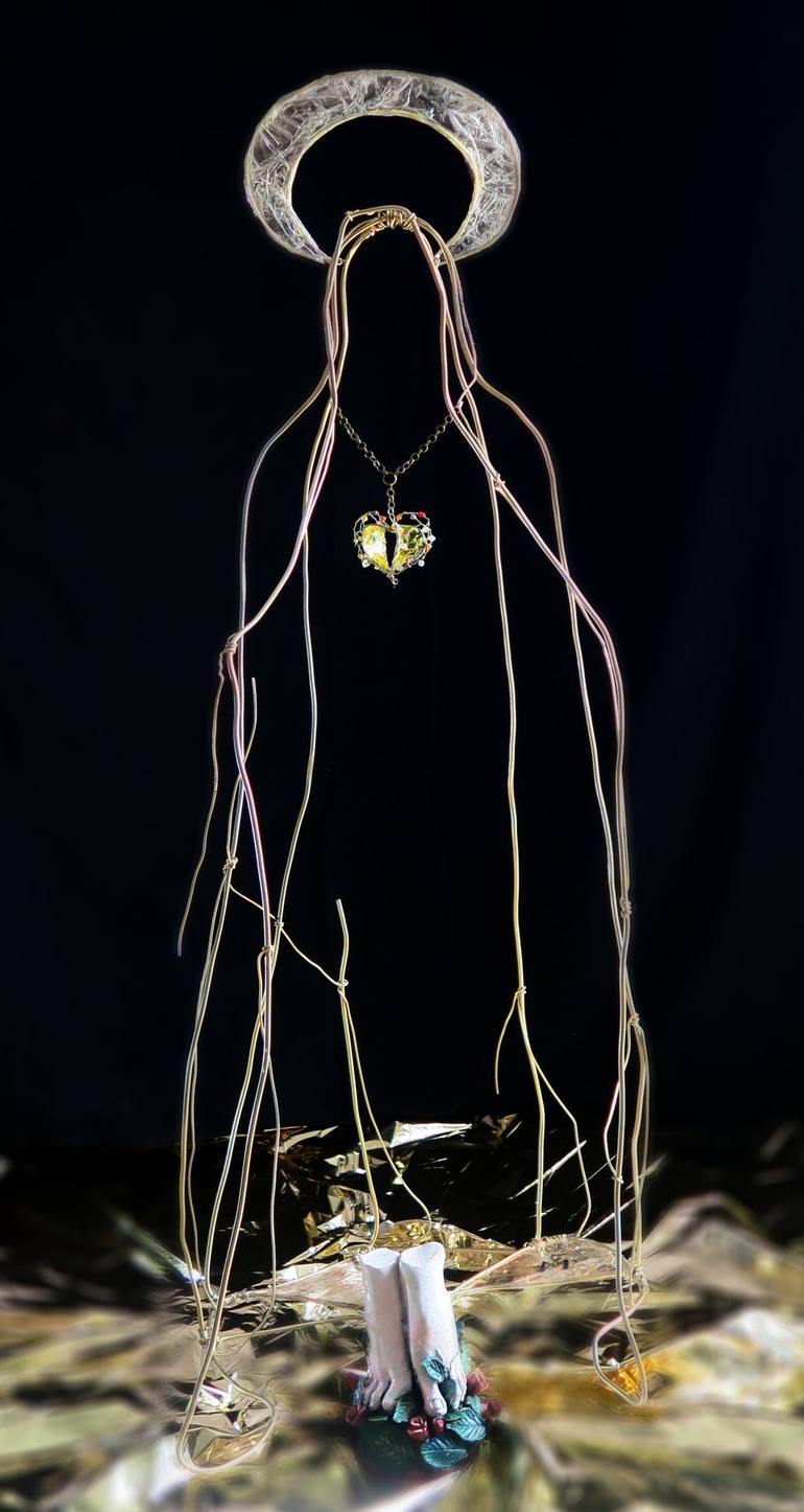 Virgin Mary symbolic appears showing she´s made of a sacred ethereal substance that only becames real when touches the ground revealing her feet. This image shows Mary as a Path to direct our eyes and faith to God.