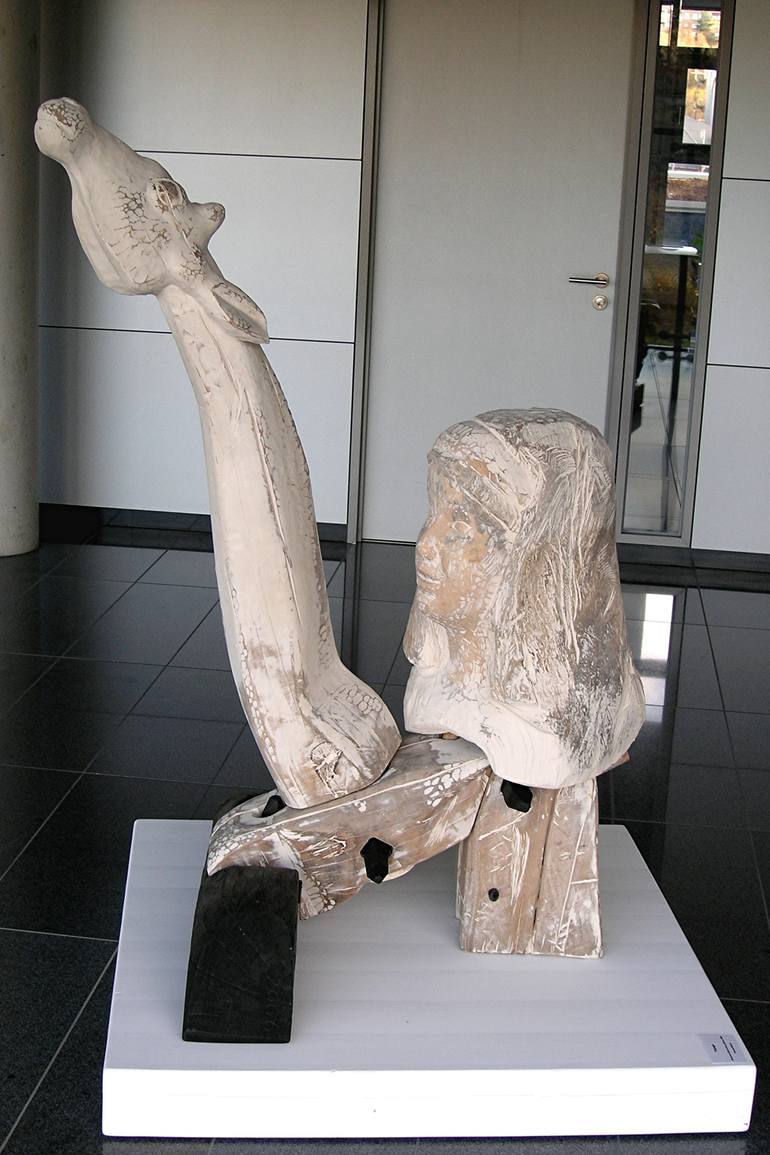 One of a kind / unique piece of art sculpted in oak, pear tree and lime wood - via an ancient technique its surface has been covered in chalk apart from the oak wood that transferred into black via a natural/chemical process. It's a long story of how this sculpture evolved - in particular the woman ...