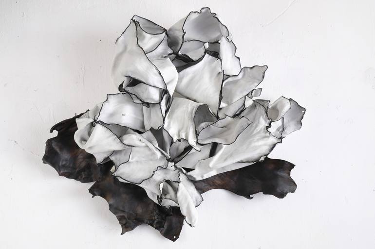 Wall sculpture made out of heated leather. Appearance and touch is like ceramic. handprinted with acrylic paint. Powerful while relaxing, this work invites peace of mind. It shows perfectly with all kinds of background.