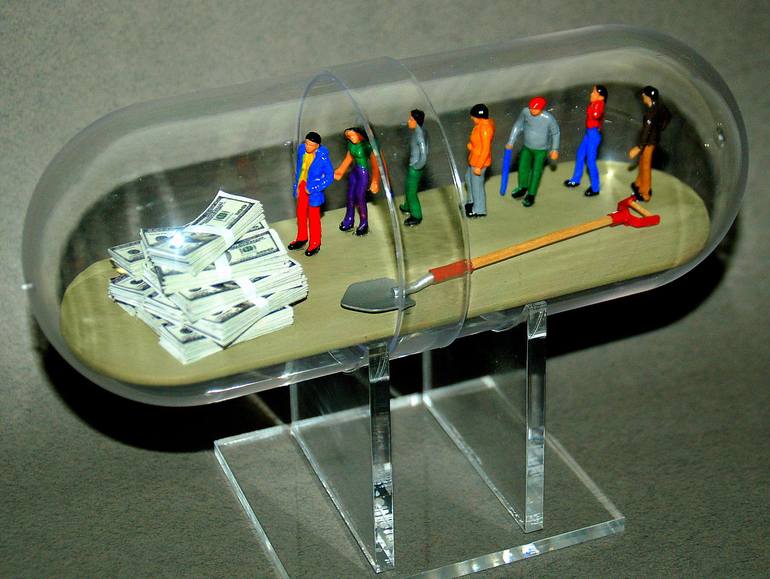 Wouldn’t it be great to have a pill that could resolve all the conflicts that arise from the gross disparity of labor exploitation and social stratification that we now have functioning under capitalism? Here it is! Materials: Wood, paper, metal, acrylic plastic, acrylic paint