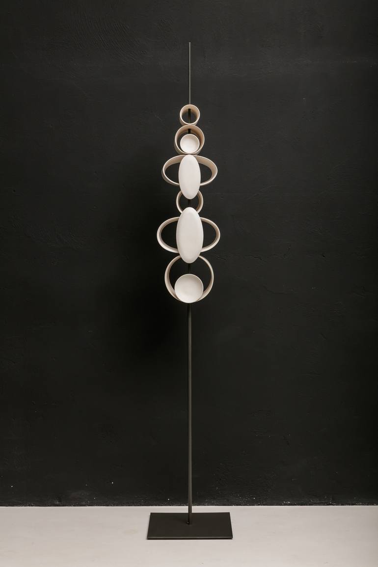 This white stoneware sculpture belongs to a family called Sequences. It is a series of elements that follow one after the other and are related to each other, since they all start from the same cylindrical shape made on a lathe. The cylinders are deformed, creating ellipses or circles of different s...