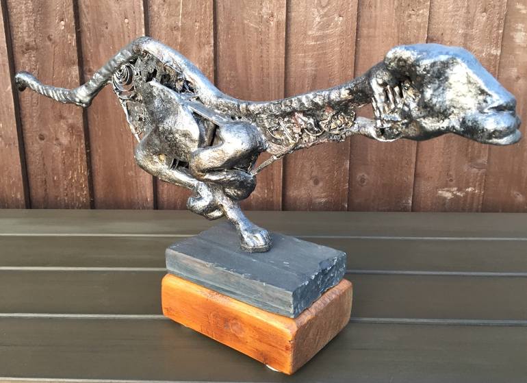 The main body of the sculpture is made from thick wire as a structural frame. It has old circuits, small electrical components, watch and clock parts attached to it. Air dried clay was used for the main features, head, tail, legs and torso, finished off with several shades of metallic paint. The bas...